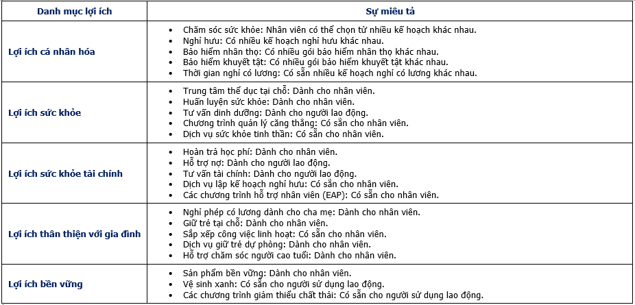 Bảng dưới đây cung cấp thông tin tổng quan về các xu hướng mới nổi này, được phân thành năm lĩnh vực chính: Lợi ích cá nhân, Lợi ích sức khỏe, Lợi ích sức khỏe tài chính, Lợi ích thân thiện với gia đình và Lợi ích bền vững. Mỗi danh mục nêu bật các ví dụ cụ thể về lợi ích, chẳng hạn như kế hoạch chăm sóc sức khỏe, trung tâm thể dục tại chỗ, hoàn trả học phí, nghỉ phép có lương cho cha mẹ ,…